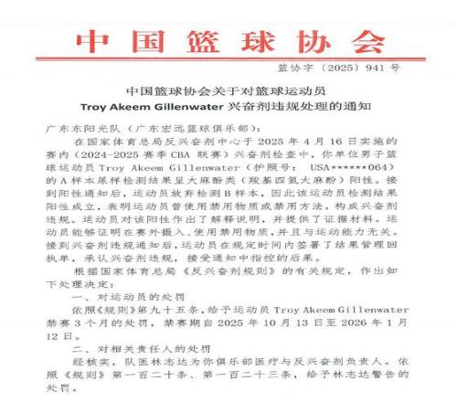 雷速体育10月13日宣 根据中国篮协官方的公示,对于上个赛季效力广东队大外援吉伦沃特兴奋剂违规处理结果正式公示。