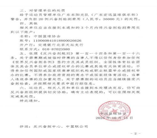中国篮协:吉伦沃特兴奋剂违规禁赛3个月,广东队承担检测费