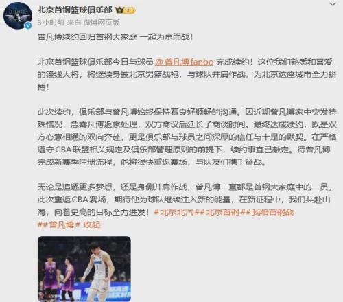 北京队正式完成与曾凡博的续约,仅需篮网向FIBA官方出示澄清信即可注册出战CBA新赛季。