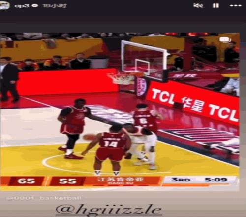 保罗在自己的INS限时动态里转发了目前效力于江苏队的前NBA潜力股贾尔斯的劲爆扣篮动态。