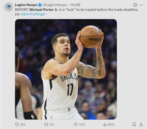 NBA名记John Hollinger报道,小迈克尔-波特在交易截止(2.6)日前被篮网送走是板上钉钉的事,篮网想要趁着小波特打出生涯最佳表现时,实现交易价值最大化。目前勇士、活塞和雄鹿都表达了兴趣,其中最积极的就是勇士队。